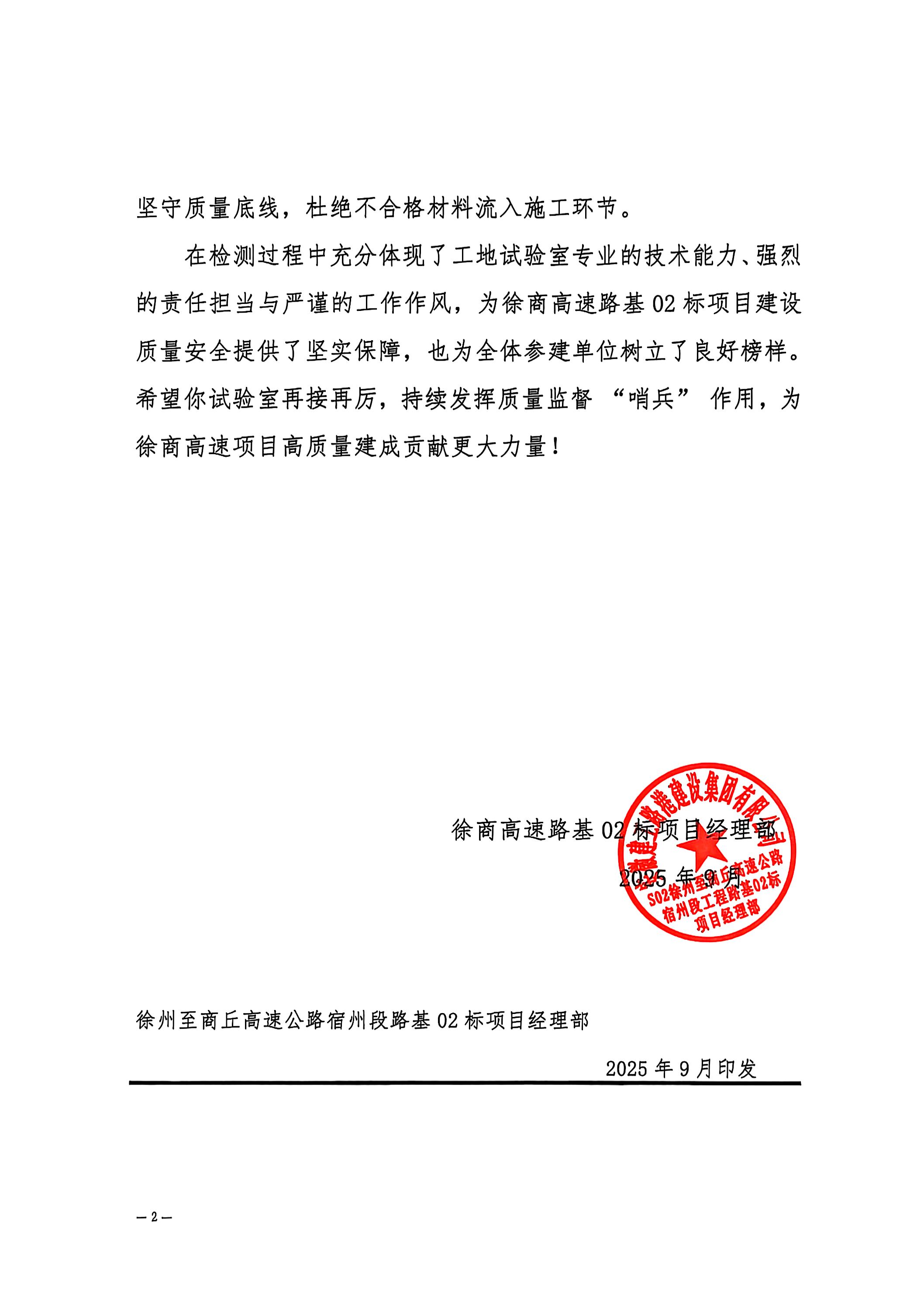 近日,S02徐商高速路基02標(biāo)項(xiàng)目試驗(yàn)室收到表揚(yáng)信,信中對其在項(xiàng)目建設(shè)過程中嚴(yán)格把控質(zhì)量,切實(shí)保障項(xiàng)目建設(shè)進(jìn)度和質(zhì)量安全方面的突出表現(xiàn)進(jìn)行通報(bào)表彰。