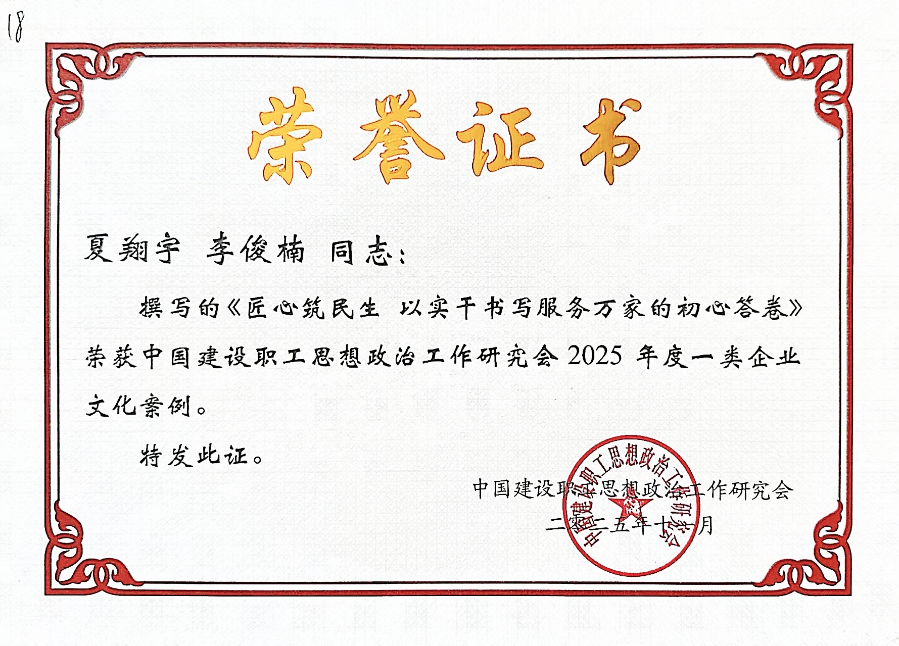 近日,中國建設職工思想政治工作研究會公布2025年度中國建設職工思想政治研究會企業(yè)文化案例表彰結果,公司報送的《匠心筑民生 以實干書寫服務萬家的初心答卷》獲評一類企業(yè)文化案例。