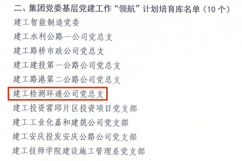 近日,安徽建工集團(tuán)黨委發(fā)布2025年度基層黨建工作 “領(lǐng)航”計(jì)劃入庫情況通報(bào),環(huán)通檢測黨總支“五心工作法”黨建品牌成功入選集團(tuán)基層黨建工作“領(lǐng)航”計(jì)劃培育庫。